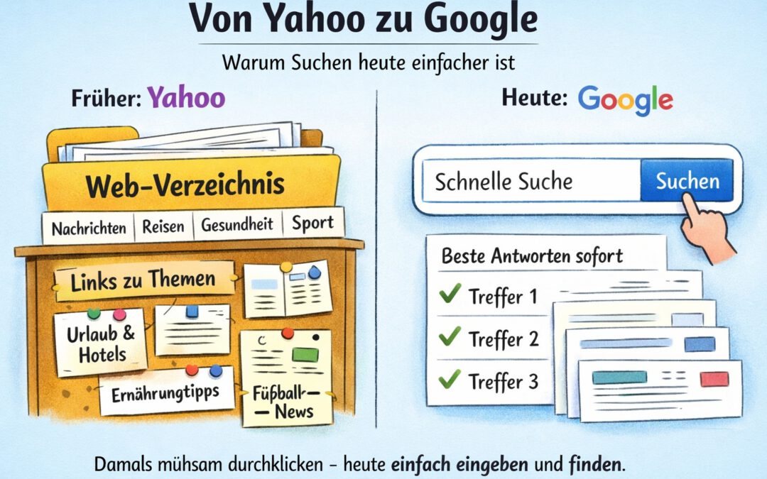 In den frühen Jahren des Internets war die Suche nach Informationen oft mühsam. Webseiten waren selten, unübersichtlich verteilt und schlecht strukturiert. Wer etwas finden wollte, brauchte Geduld – oder Glück. Zwei Namen stehen exemplarisch für diese Phase des Wandels: Yahoo und Google. Sie verkörpern zwei völlig unterschiedliche Ansätze, das Internet zu ordnen.