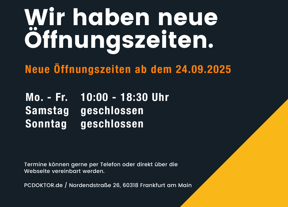 Aufgrund der stark gestiegenen Nachfrage im Zusammenhang mit der Umstellung von Windows 10 sowie des heute mittlerweile normalen Personalmangels bleibt unser sagenhaftes Geschäft im Nordend Frankfurts ab dem 24. September 2025 samstags vorerst leider geschlossen.